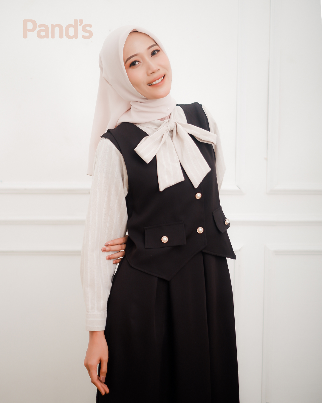 Atasan dengan aksen pita besar dan outer vest memberi nuansa feminin sekaligus chic. Potongan rok A-line yang mengalir membuat siluet tampak anggun dan tetap sopan.